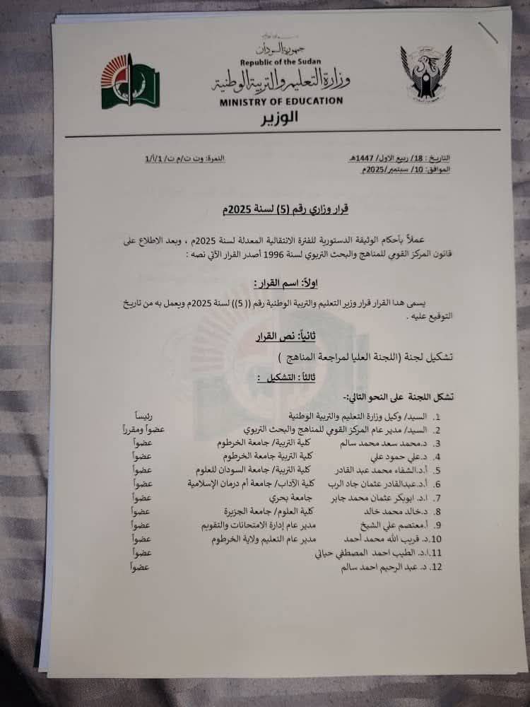 أصدر الدكتور تهامي الزين حجر، وزير التعليم والتربية الوطنية، القرار رقم (5) لسنة 2025، بشأن تشكيل لجنة عليا مختصة بمراجعة مناهج التعليم العام في البلاد.