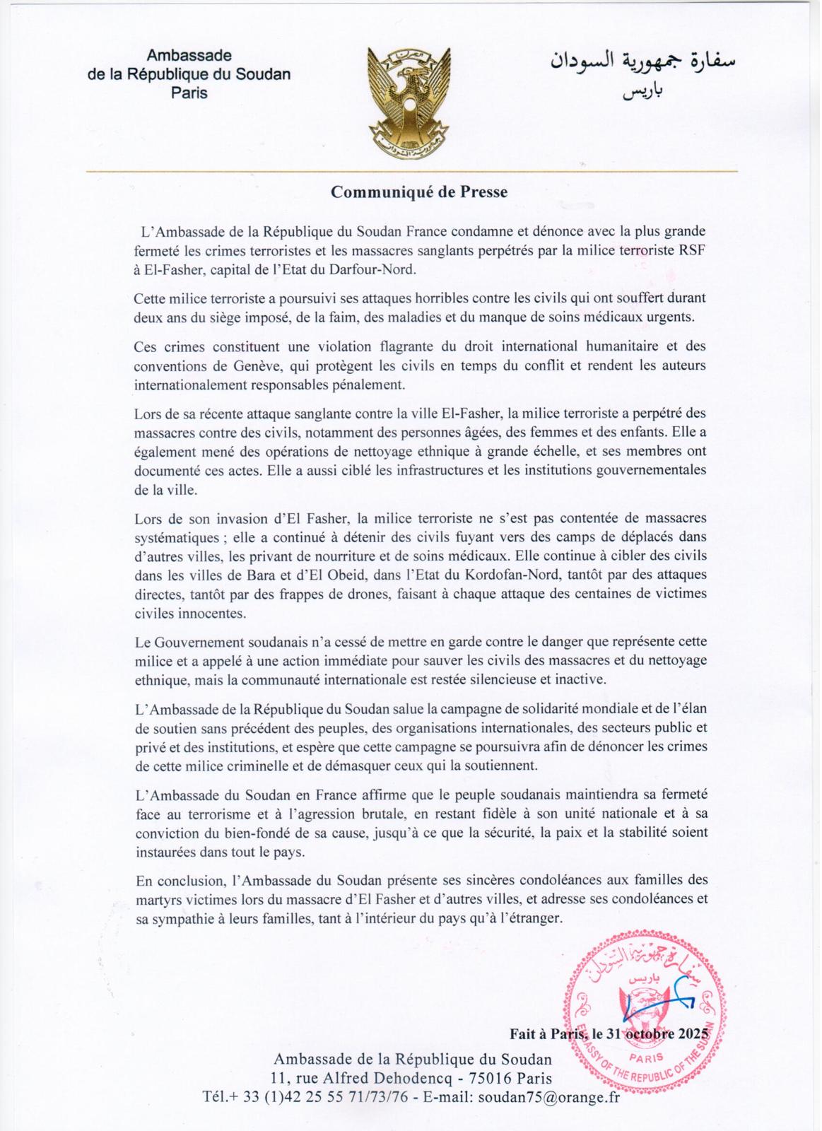 السفارة السودانية في باريس تطالب بتصنيف ميليشيا الفاشر المتمردة جماعة إرهابية