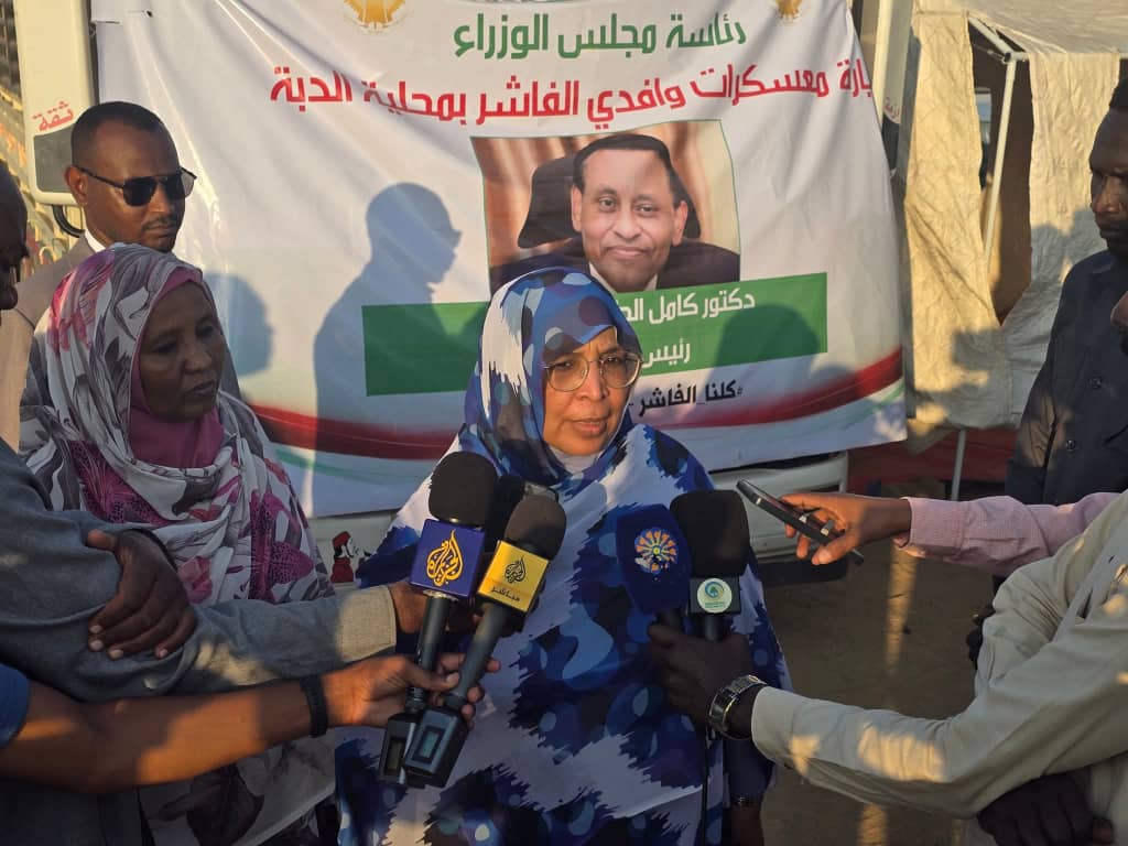 جاء ذلك في كلمتها التي ألقتها اليوم الأربعاء، خلال زيارتها التفقدية لمعسكر العفاض للنازحين من مدينة الفاشر بمدينة الدبة في الولاية الشمالية، برفقة وفد وزاري رفيع.