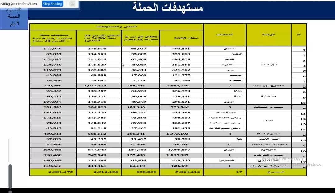 وقال رئيس الغرفة الاتحادية لحملة التطعيم ضد الدفتيريا، محمد الحسين الحاج، في تصريح صحفي، إن الحملة تستهدف جميع محليات ولاية نهر النيل كجولة ثانية، فيما تشمل الجولة الأولى ولايات الخرطوم (محلية كرري)، والشمالية (دنقلا، مروي، الدبة)، والبحر الأحمر (هيا)، والنيل الأزرق (الدمازين)، وكسلا (كسلا، خشم القربة، نهر عطبرة، حلفا الجديدة)، بمستهدف يتجاوز مليوني شخص من الفئات العمرية بين 5 و20 عامًا، عبر جميع الاستراتيجيات: المراكز الثابتة والجوالة والفرعية.