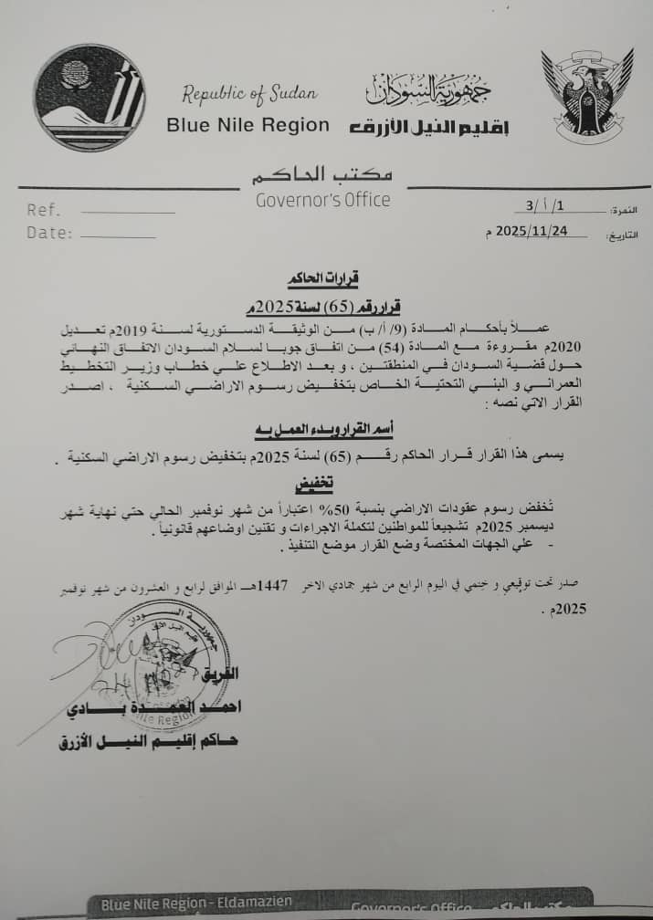 حاكم النيل الأزرق يخفض رسوم عقود الأراضي 50% حتى نهاية ديسمبر
