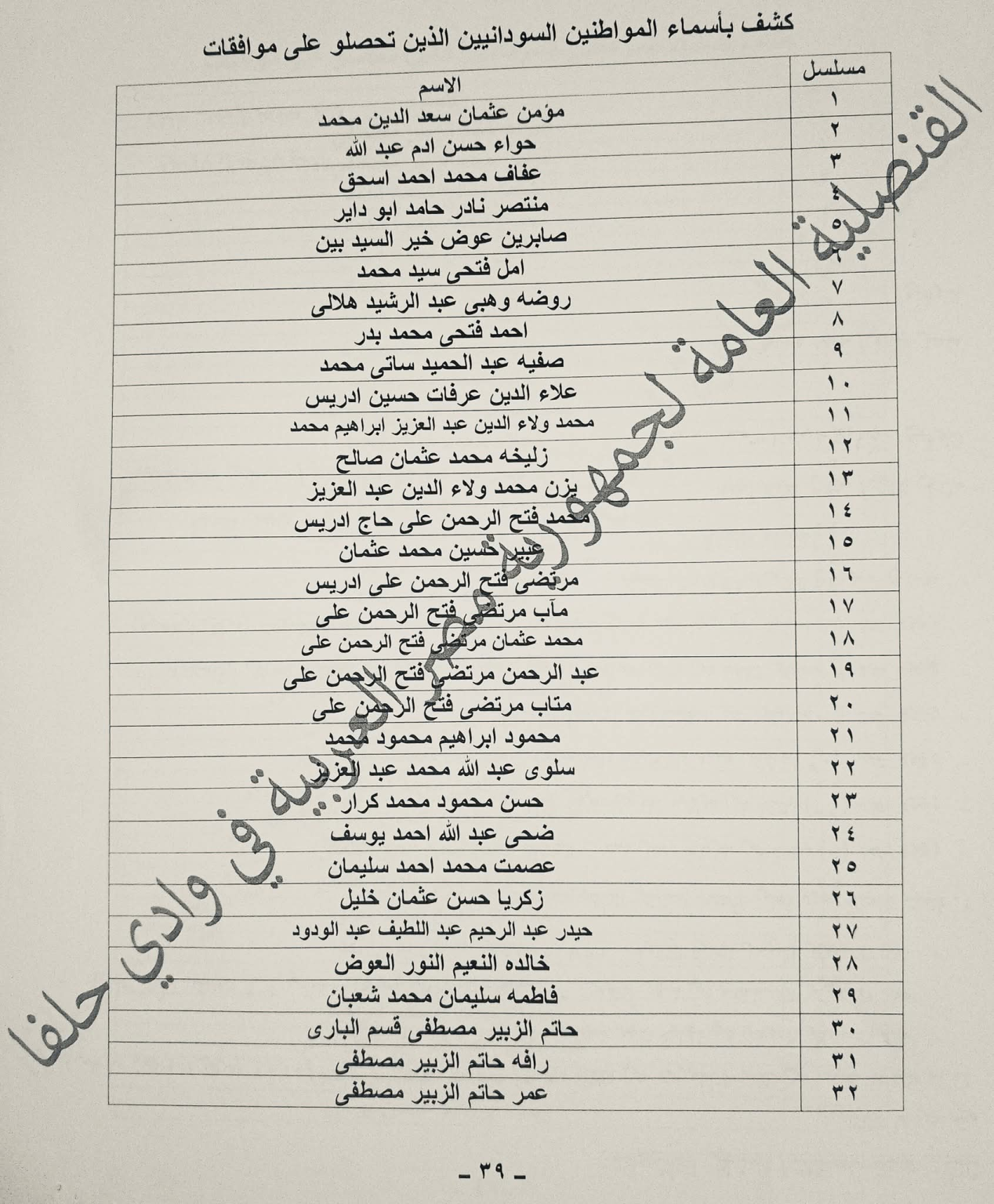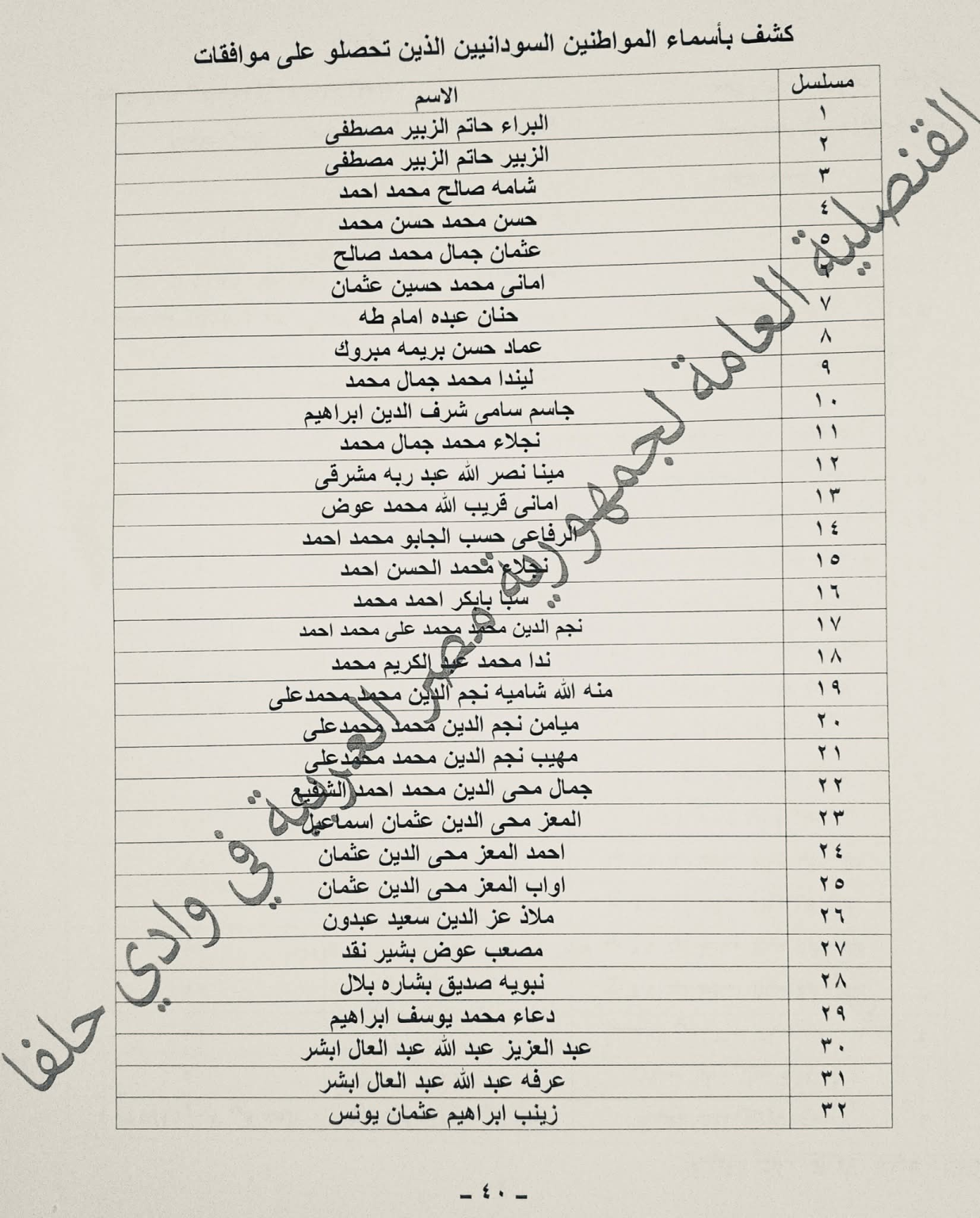 أعلنت القنصلية العامة لجمهورية مصر العربية في مدينة وادي حلفا عن صدور موافقات منح التأشيرات لعدد من المواطنين السودانيين، ودعت الأسماء الواردة في الكشوف المرفقة إلى تسليم جوازات سفرهم بأنفسهم ابتداءً من يوم الأربعاء الموافق 26 نوفمبر 2025، وذلك خلال الفترة من الساعة العاشرة صباحاً وحتى الواحدة ظهراً.