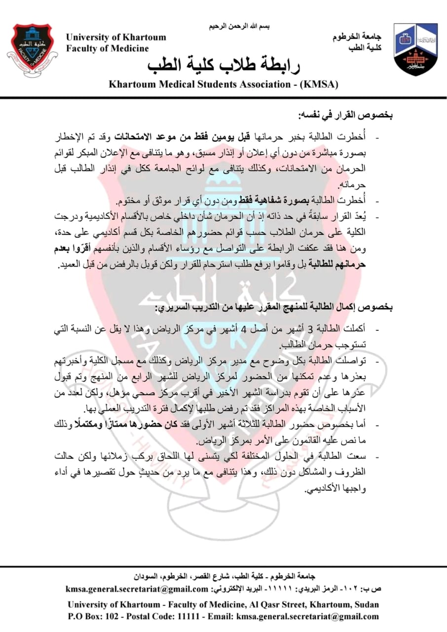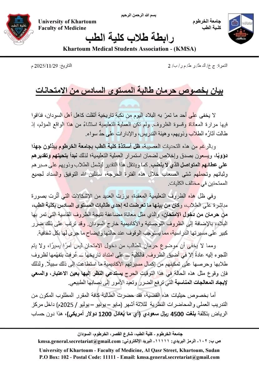 ودعت رابطة طلاب كلية الطب وطلاب الرياض إدارة جامعة الخرطوم إلى التدخل الفوري لمعالجة قرارات الحرمان غير المبررة، وضمان العدالة وتكافؤ الفرص بين جميع الطلاب.