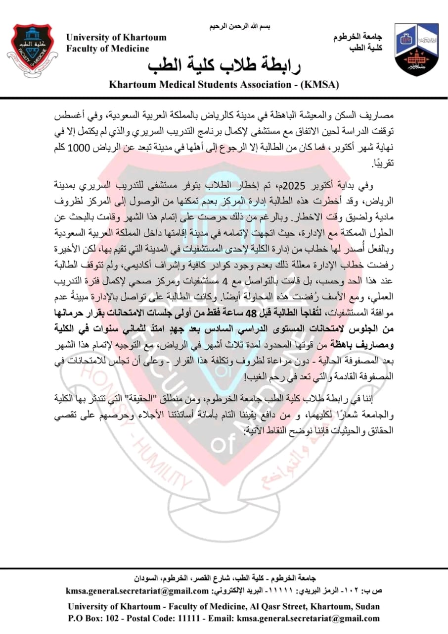 وتضمن البيان تفاصيل عن اضطرابات في تنسيق التدريب السريري نتيجة غياب الاتفاق بين الكلية والجهات المشرفة في الرياض، ما أدى إلى توقف التدريب في أغسطس الماضي. واضطر عدد من الطلاب للعودة إلى أسرهم بسبب عدم توفر السكن وارتفاع المصروفات، في ظل عجز الكلية عن تقديم حلول بديلة حتى شهر أكتوبر.