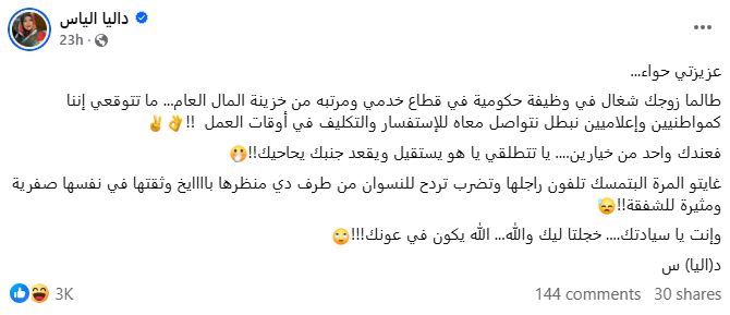 داليا إلياس تفجر جدلًا برسالة نارية لمسؤول حكومي: «لو زوجتك بترد على تلفون الشغل.. يا تطلقها يا تستقيل وتقعد جنبها»