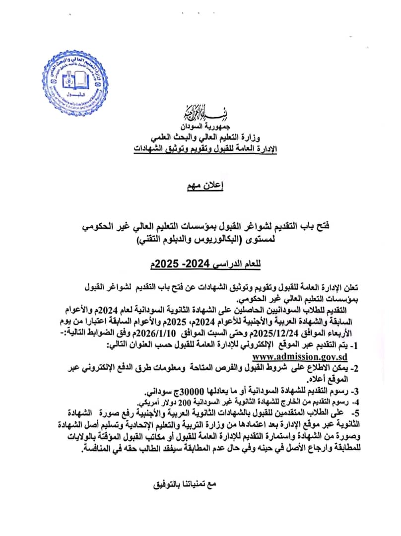 ويشمل التقديم الطلاب السودانيين الحاصلين على الشهادة الثانوية لعام 2024م والأعوام السابقة، بالإضافة إلى الشهادات العربية والأجنبية للأعوام 2024م، 2025م والأعوام السابقة، اعتباراً من يوم الأربعاء 24 ديسمبر 2025م وحتى السبت 10 يناير 2026م، وفق الضوابط التالية: