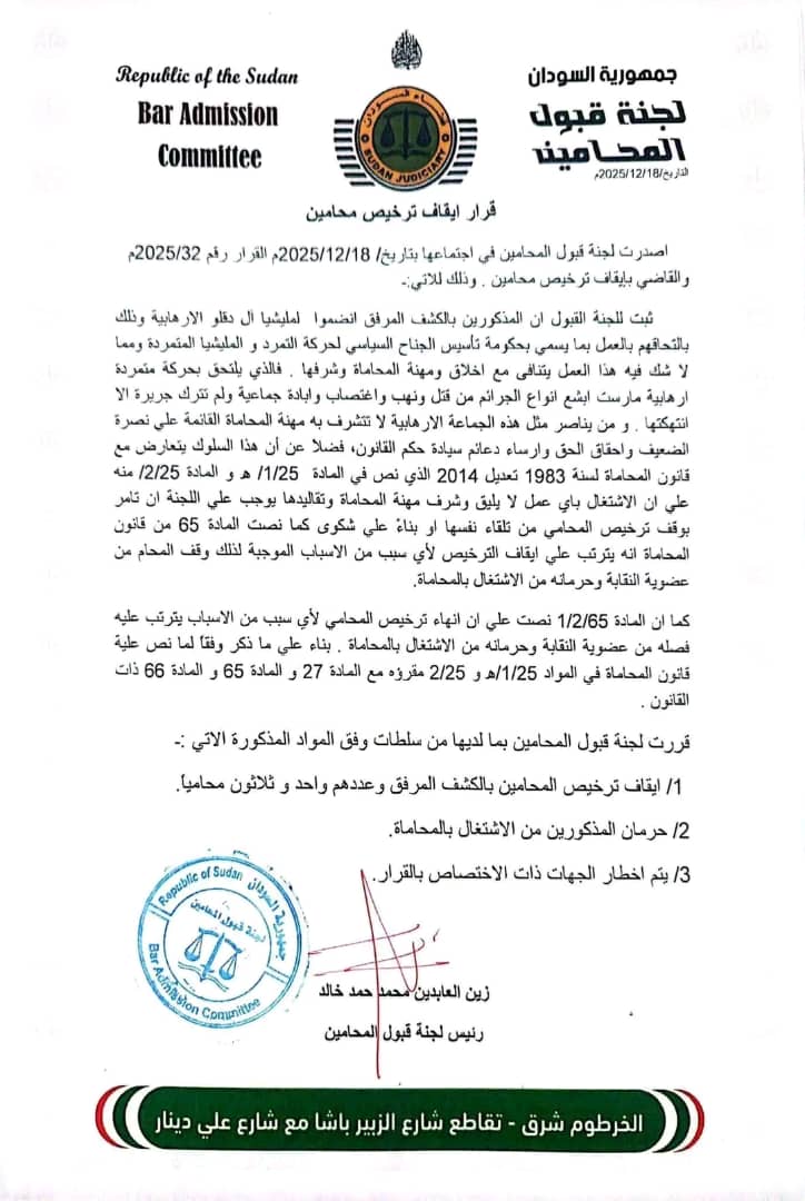 أعلنت لجنة قبول المحامين بالسودان، إيقاف تراخيص 41 محاميًا، بعد ثبوت تورطهم في مخالفات مهنية جسيمة، من بينها العمل كمستشارين قانونيين لميلشيا الجنجويد.