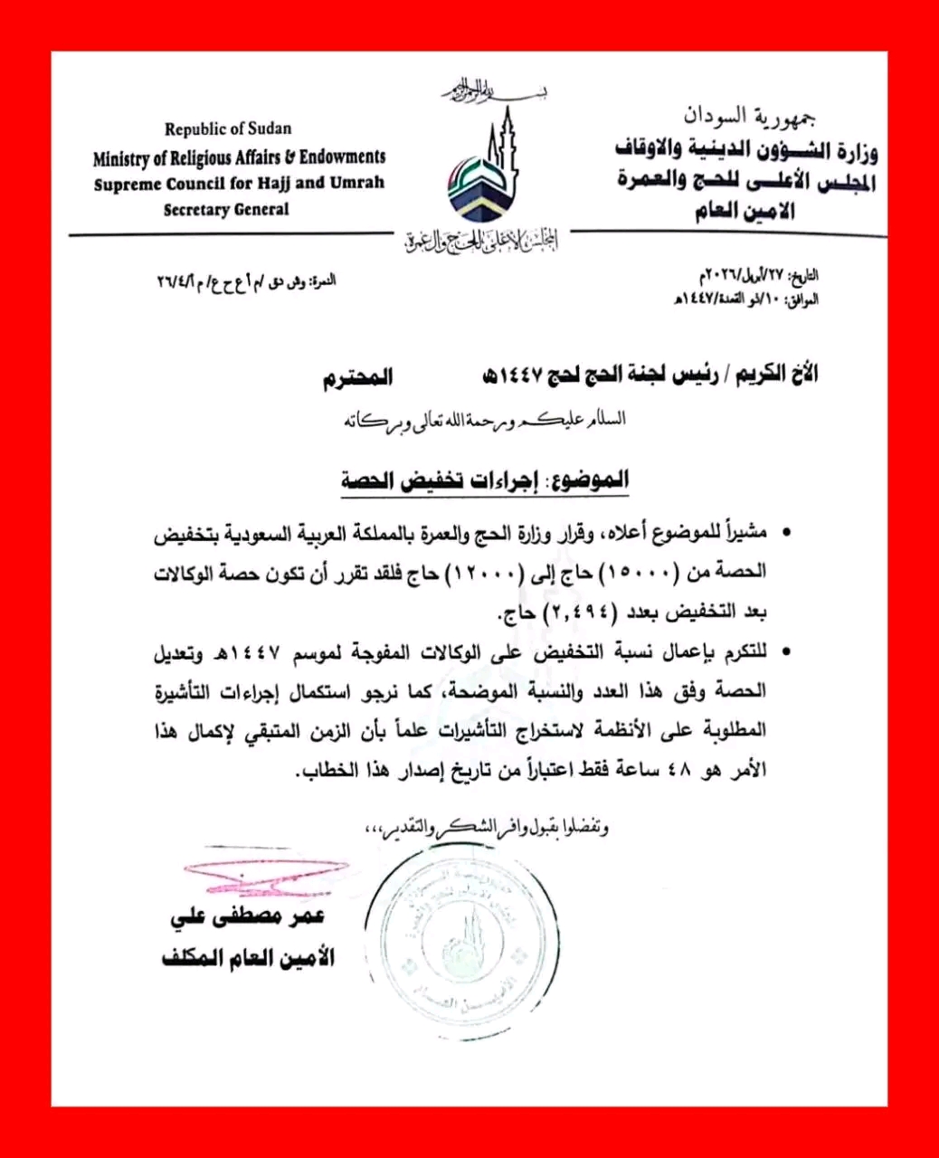 ووفقاً للخطاب الذي وقّعه الأمين العام المكلف مصطفى علي، فقد تقرر أن تكون حصة الوكالات بعد التخفيض بعدد 2494 حاجاً فقط، مع وجوب "التكرير بإعمال نسبة التخفيض على الوكالات المفوجة" وتعديل حصصها وفق النسبة المحددة.